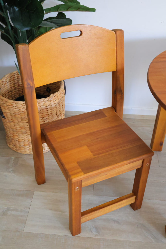 These Acacia Stacking chairs are designed primarily for kinder children The chair features a generous sized seat, and is sturdy, oiled and stained! The large seat makes it very comfortable for parents and kinder teacher to sit on. It is stack-able, and space saving and will last for generations! All materials used are child-safe and non-toxic. Recommended Max Weight for frequent users: 30kgs seat. The colour of this furniture set may vary due to the natural timber variations found in the wood.
