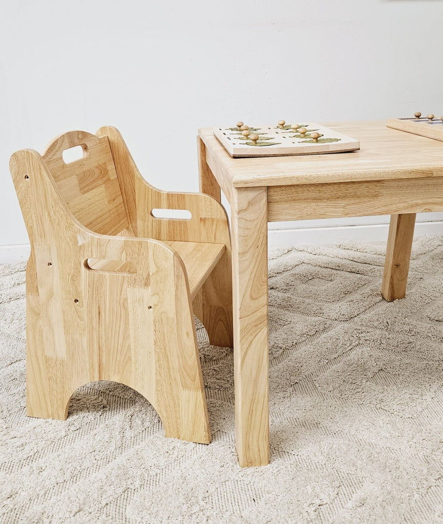 This solid rubberwood furniture set comprises a compact table and two proportionally designed chairs engineered for toddlers. The oiled rubberwood construction provides durability and easy maintenance, while the chair dimensions (30×27×55cm) wide tip resistant legs for added safety ensure proper ergonomic support and stability for young users. The table (75×75×50cm) offers adequate surface area for dining and activities. The flat-pack design is a combined weight of 25kg across both components. An excellent investment in functional, child-scaled furniture that balances safety with practical design. 3+years.