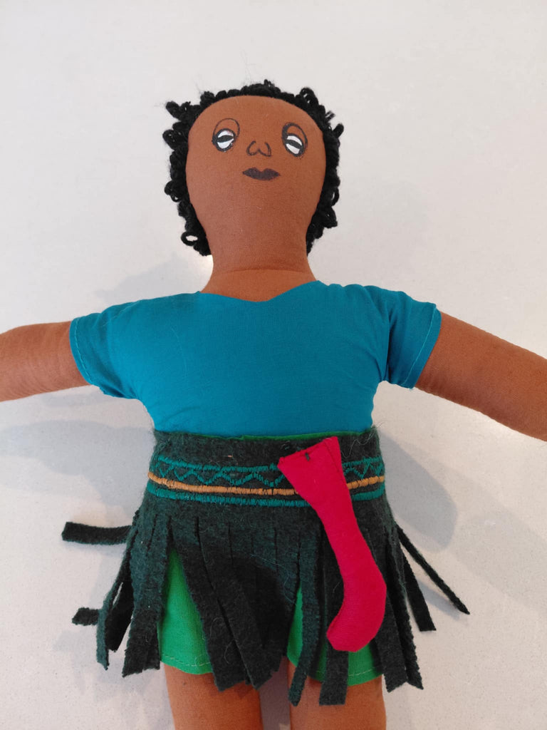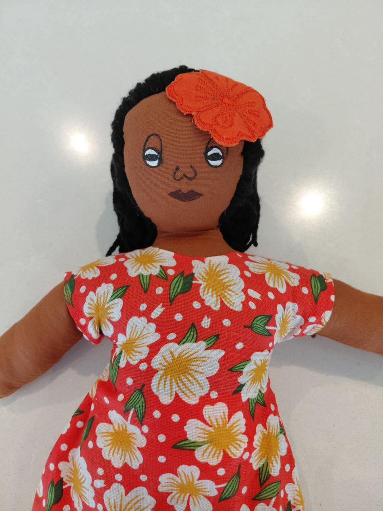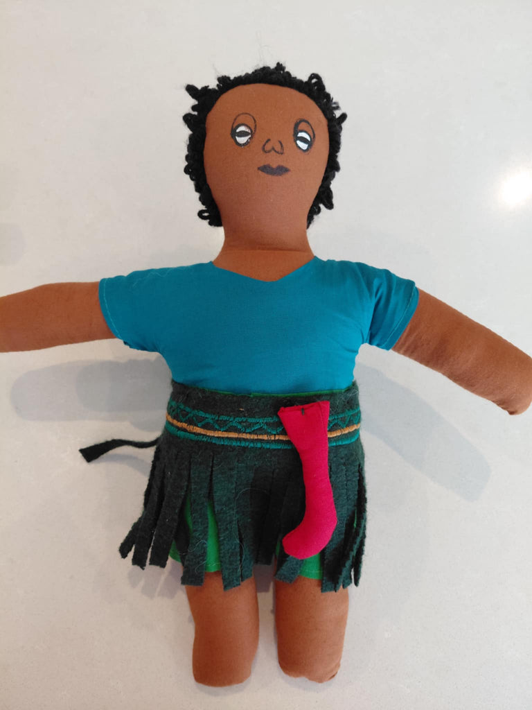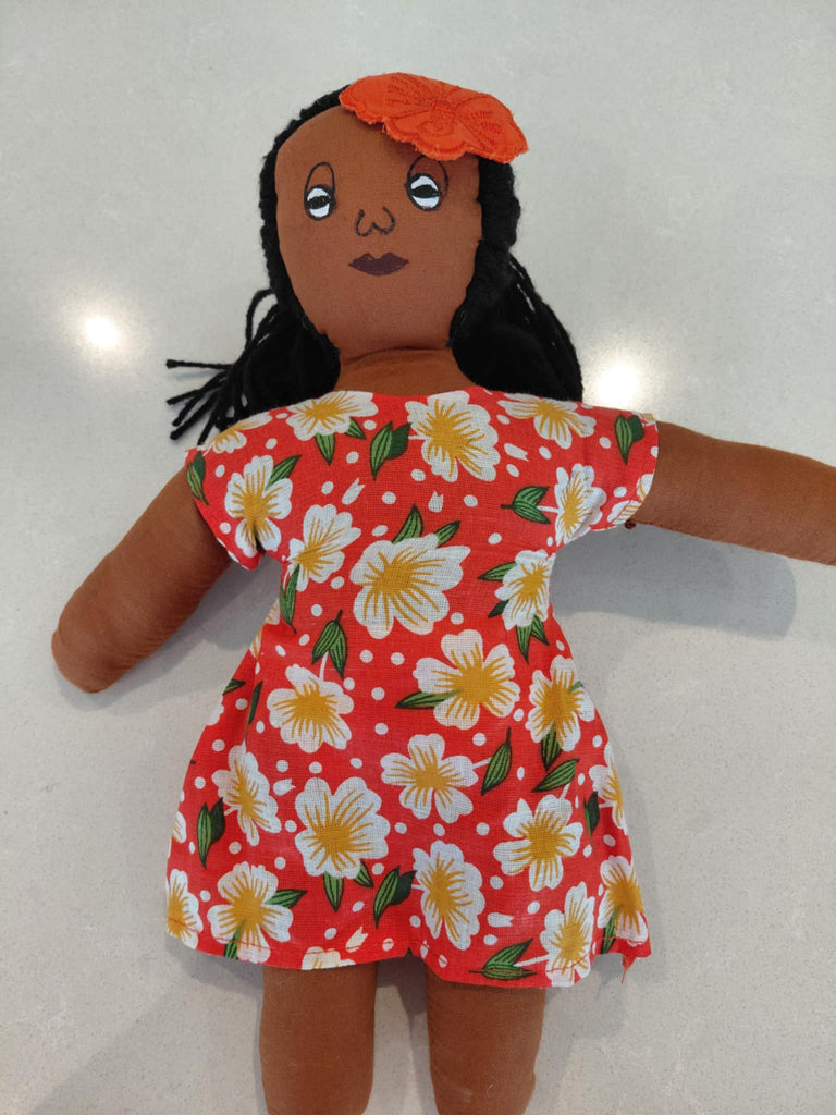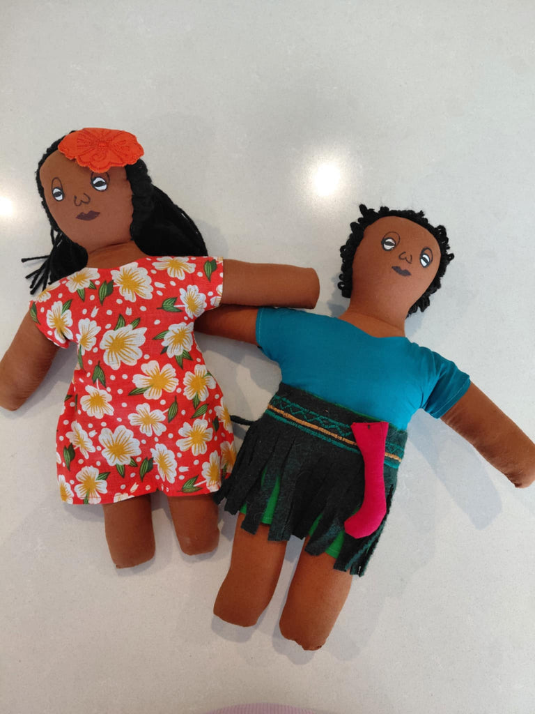 A pair of soft dolls representing Torres Strait Island culture. The girl is wearing a bright floral dress and has a floral hair adornment traditional of the Torres Strait Island culture. The boy is wearing a grass skirt which it represents the fine leaves of the pandanus palm and he carries a knife/cutting tool at his waist.